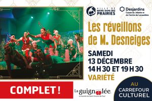 14h30 et 19h30 Au Carrefour culturel de Notre-Dame-des-Prairies VARIÉTÉ Une production de l’Ensemble traditionnel La Foulée M. Desneiges est l’ami de tous, mais personne ne le connaît vraiment. La plupart savent qu’il adore fêter et qu’il est presque toujours dehors l’hiver. Dans ce spectacle où conte, danse et musique se côtoient, M. Desneiges nous confie…