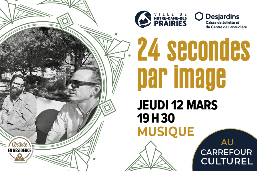 24 secondes par image est un concert-évènement où la musique et l’image se rencontrent. Dans ce cas-ci, c’est la musique de Ludovic Bonnier qui inspirera les photographies de Philippe Desrochers. Un procédé inverse à la pratique habituelle du 7e art. Vous assisterez à la création de cette oeuvre, oscillant entre la musique actuelle, contemporaine et le jazz, rehaussée par une projection d’images contemporaines de notre quotidien lanaudois. Sylvain Delisle (guitare), Stéphane Diamantakiou (contrebasse), Tommy Gauthier (violon) et d’autres musiciens s’ajouteront au binôme afin de vous partager cette carte postale musicale.