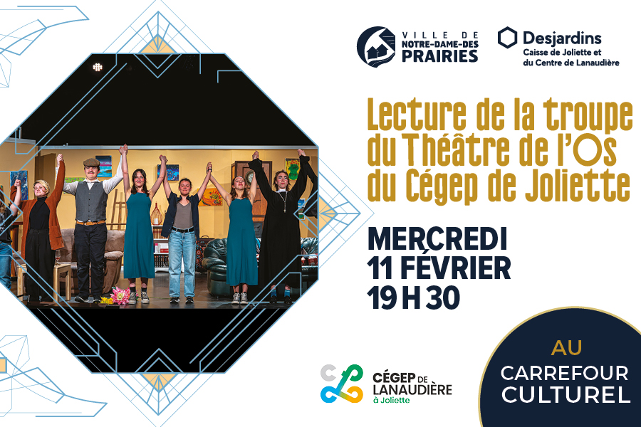 La troupe du Théâtre de l’OS regroupe des étudiantes et étudiants du Cégep à Joliette qui travaillent sous la direction d’un metteur en scène professionnel pour produire une oeuvre de qualité d’un auteur d’ici ou d’ailleurs. Une mise en lecture de la pièce est présentée en cours de processus, en vue des représentations officielles les 28 et 29 avril 2025, toujours au Carrefour culturel.