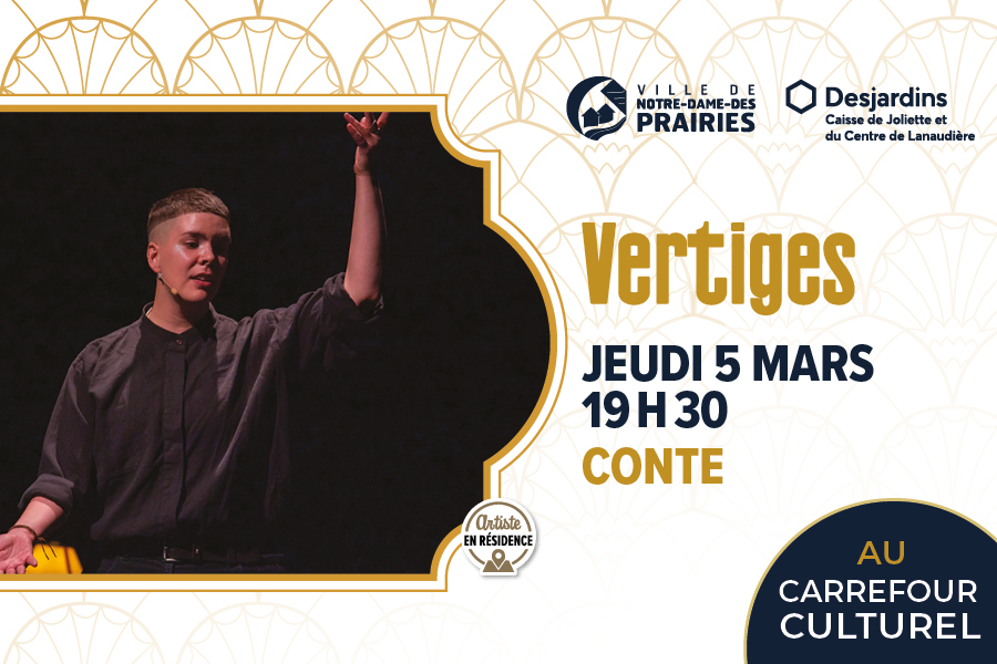 Vertiges explore le tourbillon du deuil. Ce spectacle de 75 minutes réunit contes merveilleux, chants traditionnels, harpe électronique (Minkworks) et histoires de vie. Raconté à la manière d’un récit de voyage, Dani Tardif partage les leçons tirées de son expérience du deuil et des faits ethnologiques sur la manière dont ses ancêtres franco-québécois catholiques vivaient les leurs, tout en y intégrant une perspective queer. La résidence à Notre-Dame-des-Prairies est la première phase de création de ce spectacle qui sera le premier solo de l’artiste.