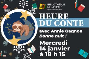 18h15 À la bibliothèque Pour les 3 à 7 ans. Que tu croules de fatigue ou que tu sois encore bien énergique, laisse-toi bercer par ces lectures du soir parfois hilarantes, parfois apaisantes, mais qui te prépareront assurément à faire de beaux rêves! Durée : 60 minutes Animation : Annie Gagnon Ouvert à tous! Réservation requise au…