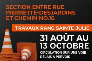 Le Canadien National (CN) devant procéder à des travaux, notez que la rue Gauthier Nord sera fermée, à la hauteur de la voie ferrée entre le boulevard Firestone et la rue Brûlé, le mardi 29 septembre de 4h à 21h. Les automobilistes seront invités à emprunter le chemin de détour aménagé sur place. Veuillez nous…